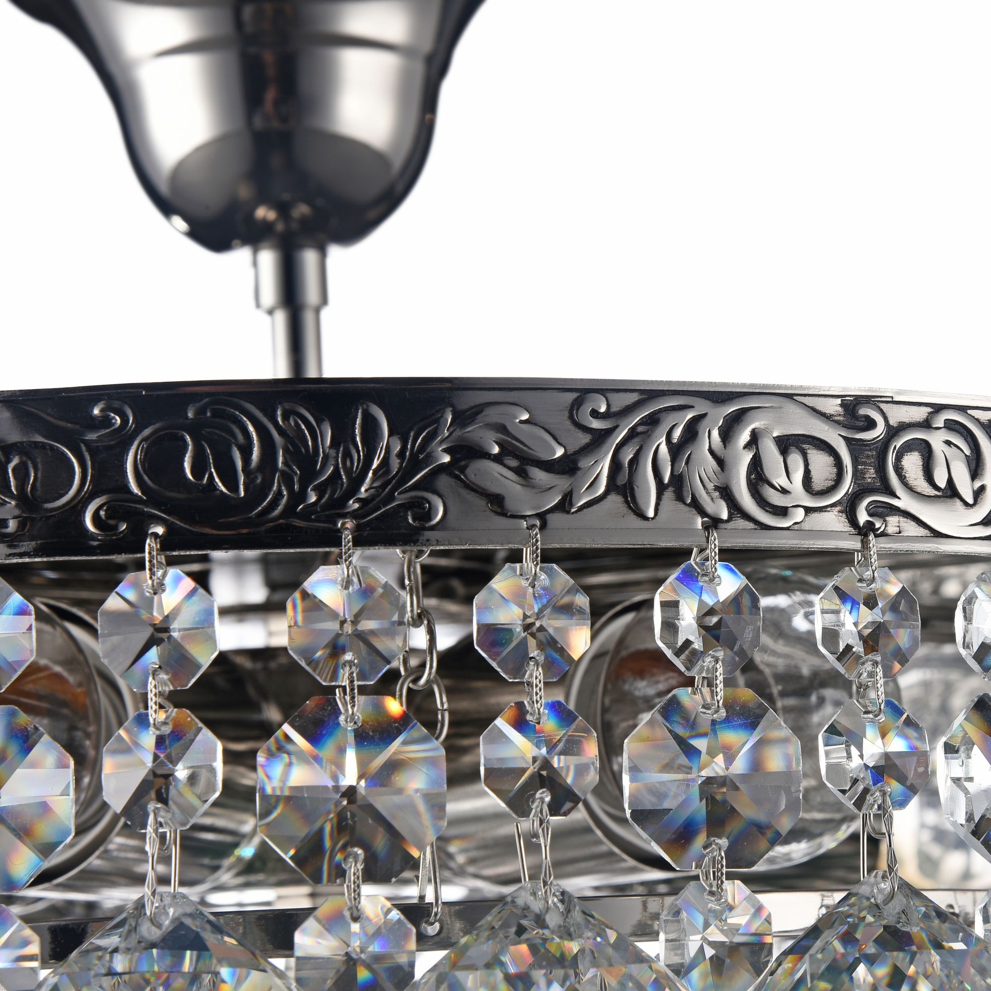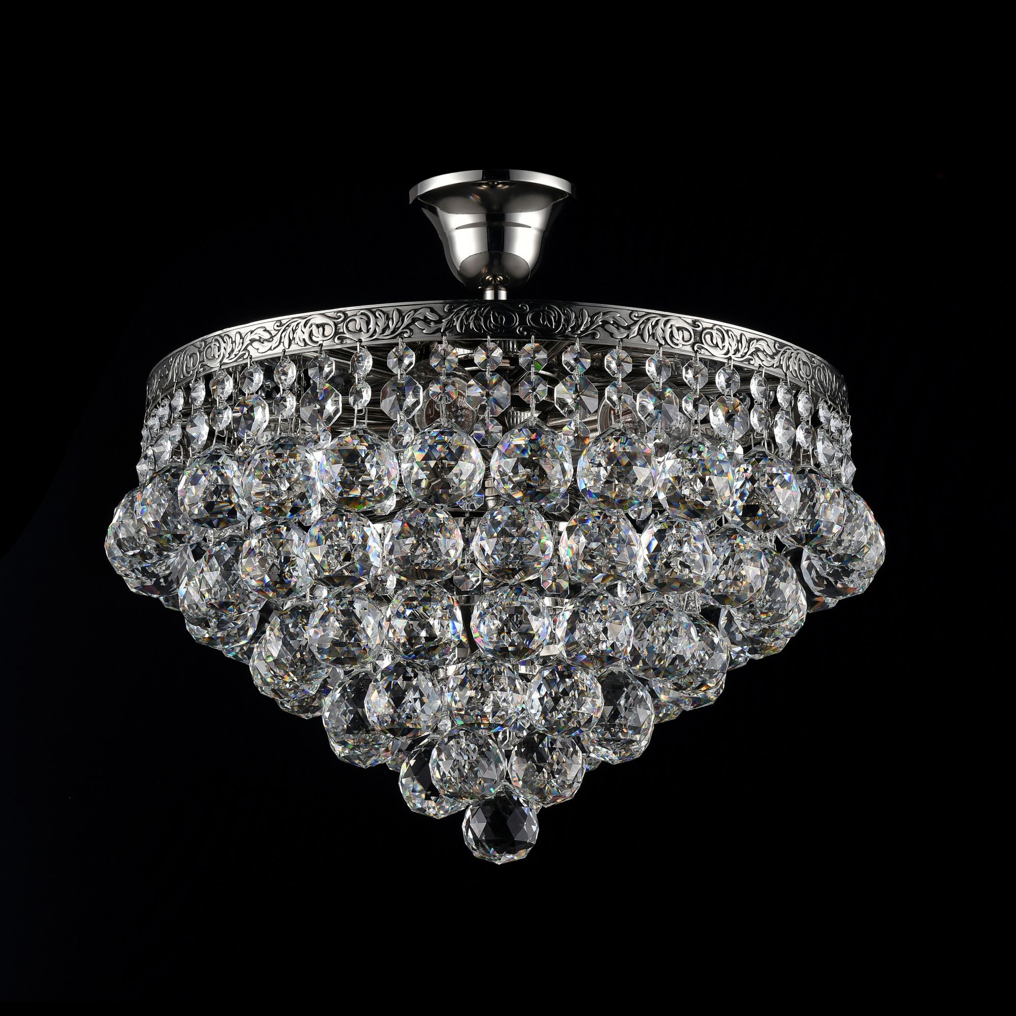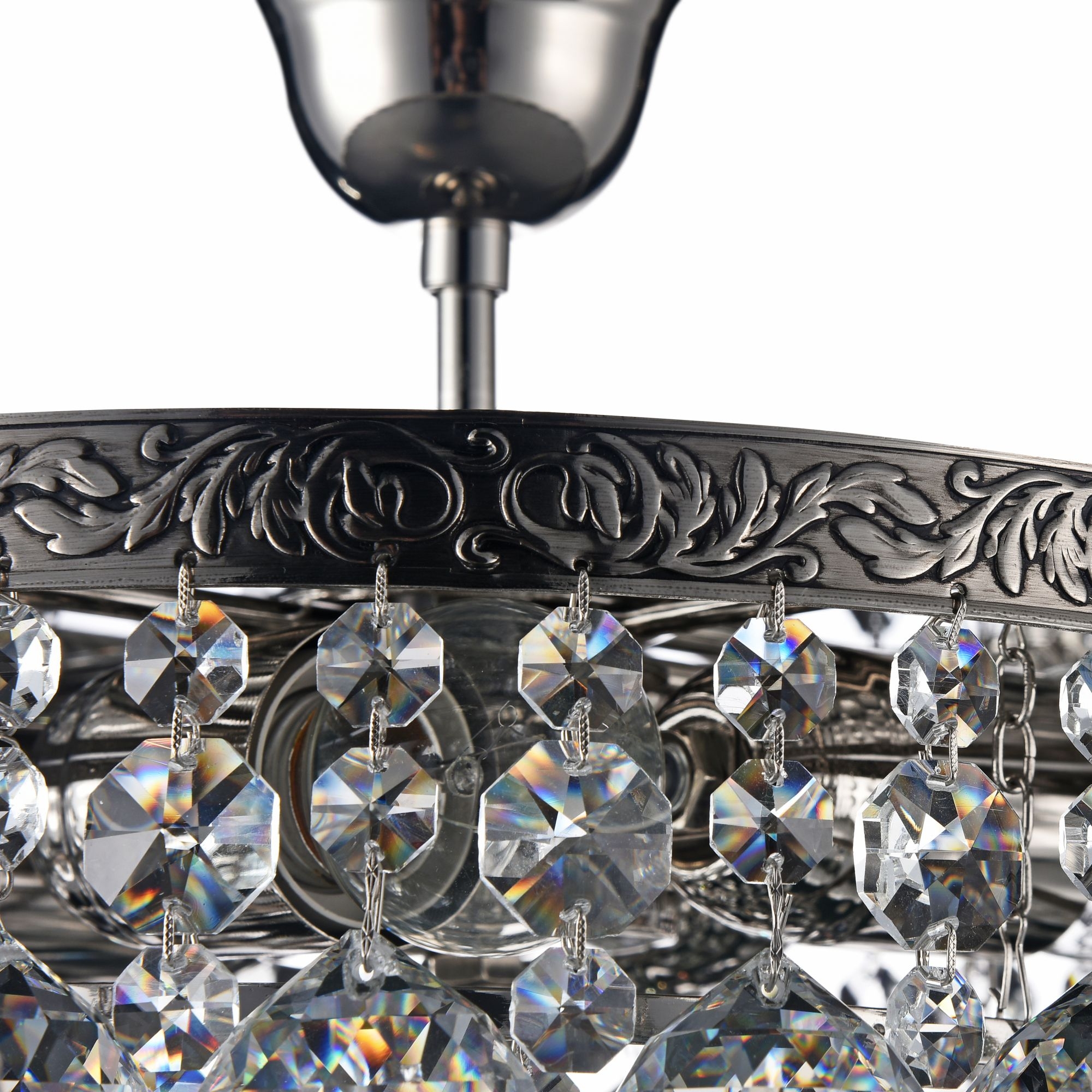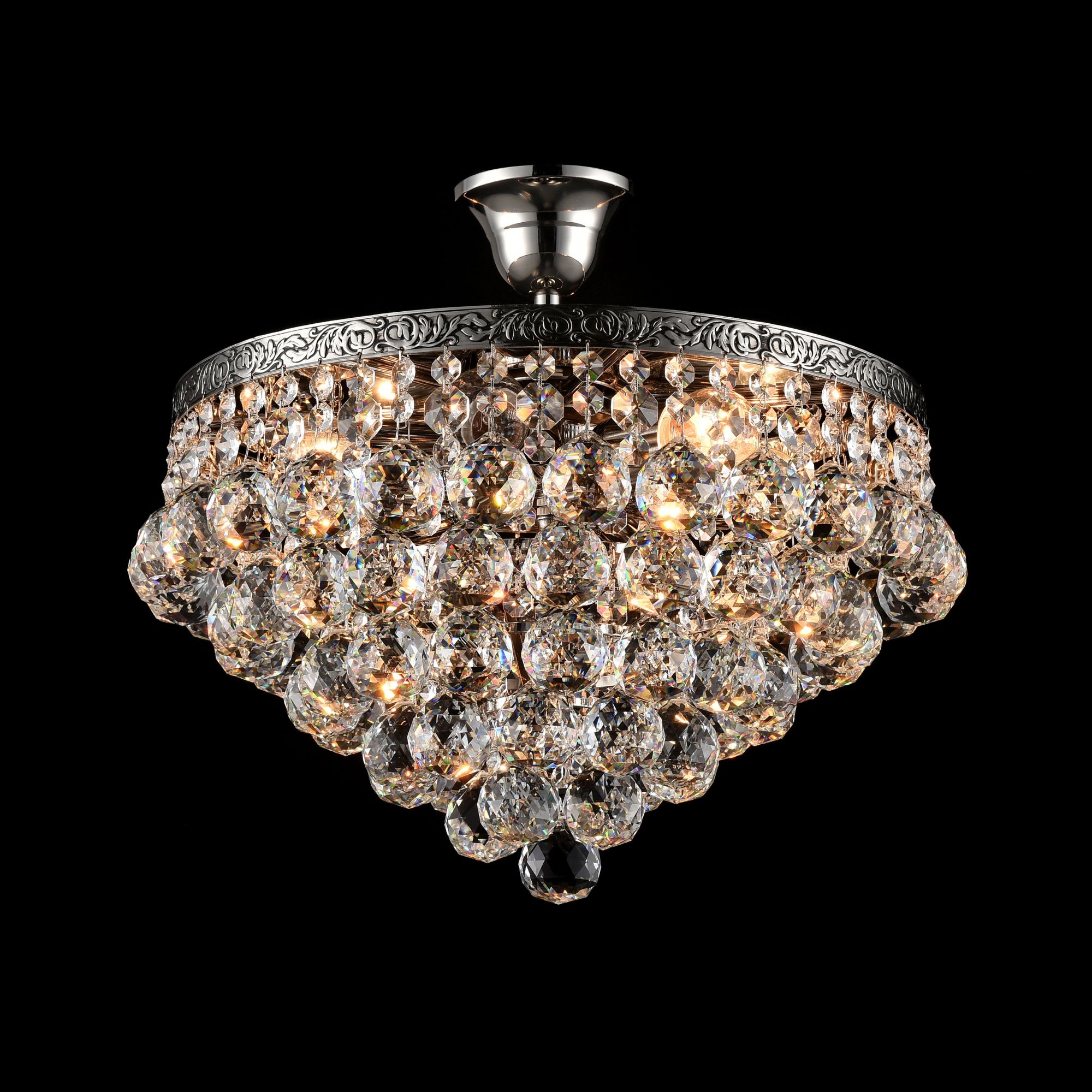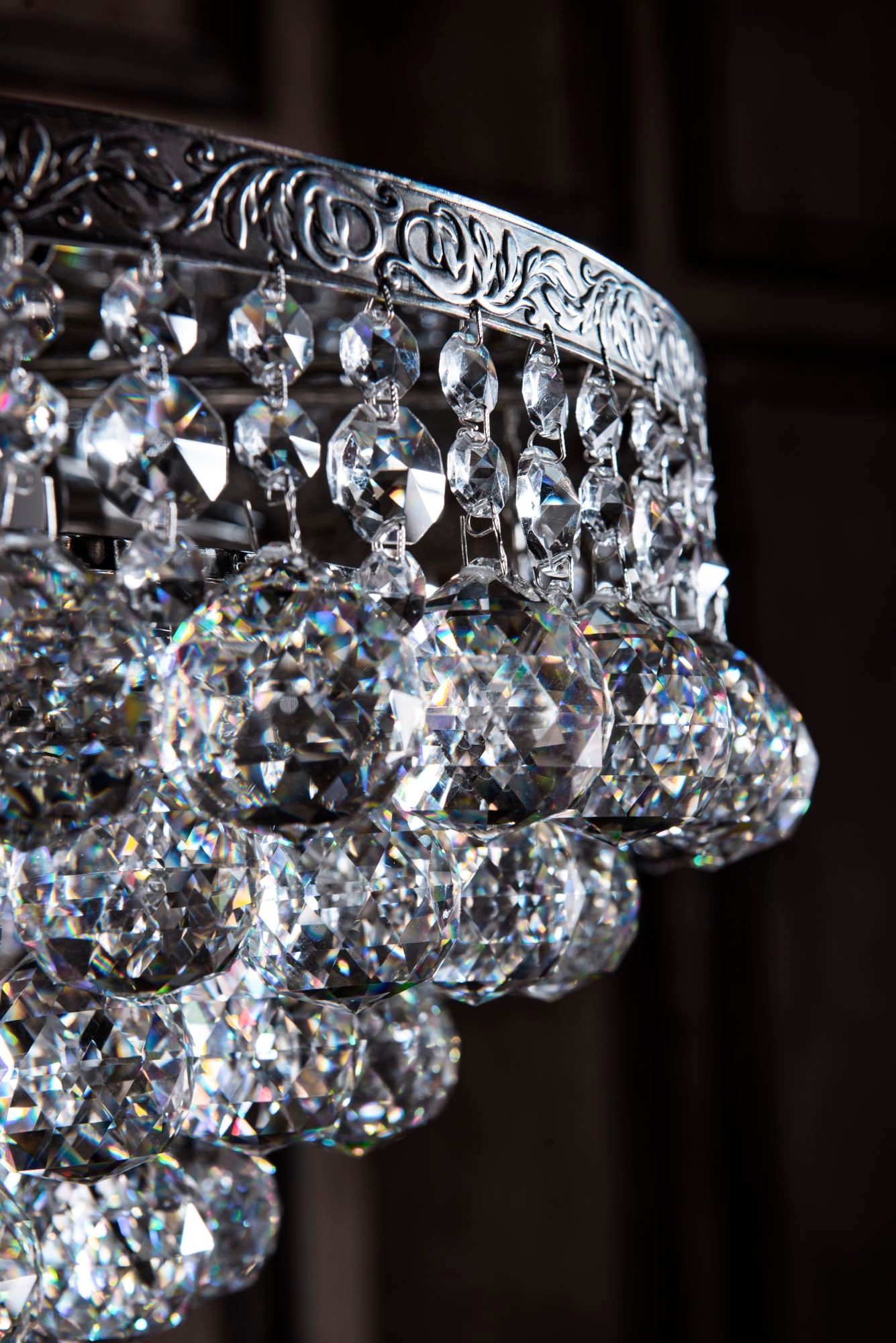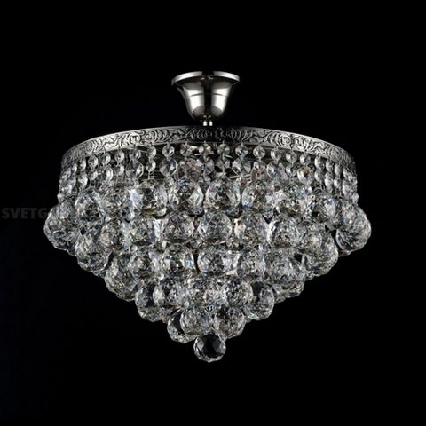 Каркас из металла цвета старинного золота и серебра, обрамлен латунной лентой с ручным чернением. Крупный хрусталь высшего класса ромбовидной огранки.