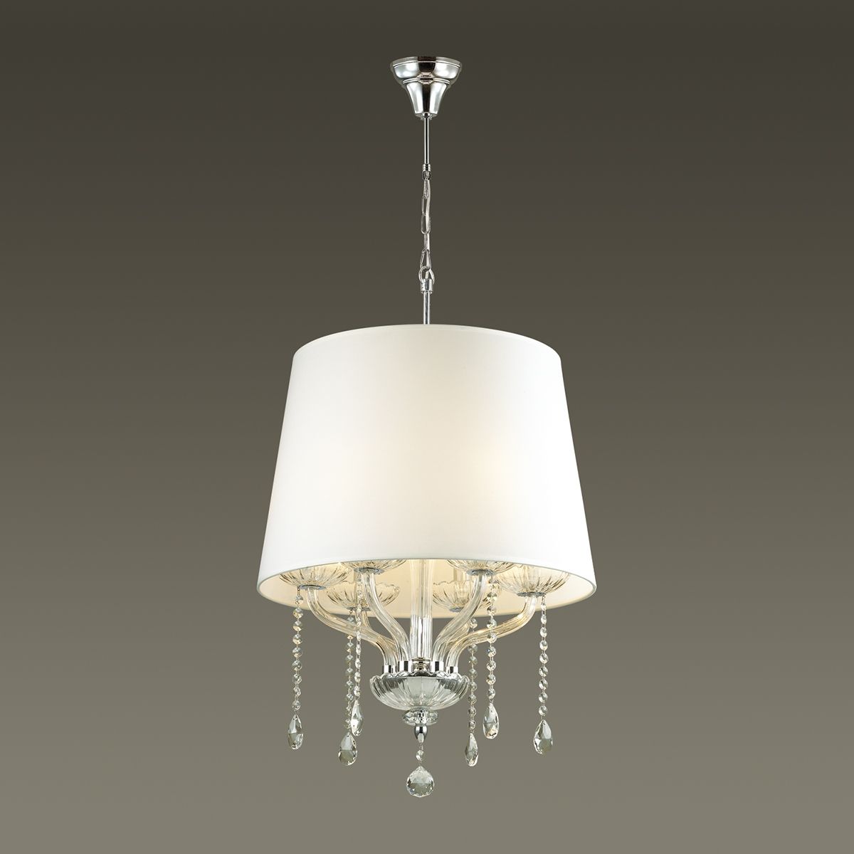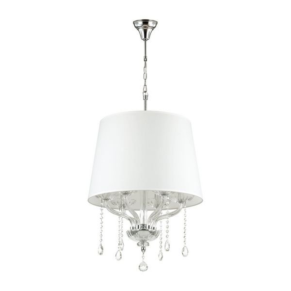 Материалы исполнения арматура, декор: металл, хрусталь; абажур: ткань. Цвет арматуры хром. Плафон в цвете: белый. Декор подвеска, материал декора хрусталь, цвет прозрачный. Люстра Teona состоит из стеклянного основания и обьемного текстильного абажура, об
